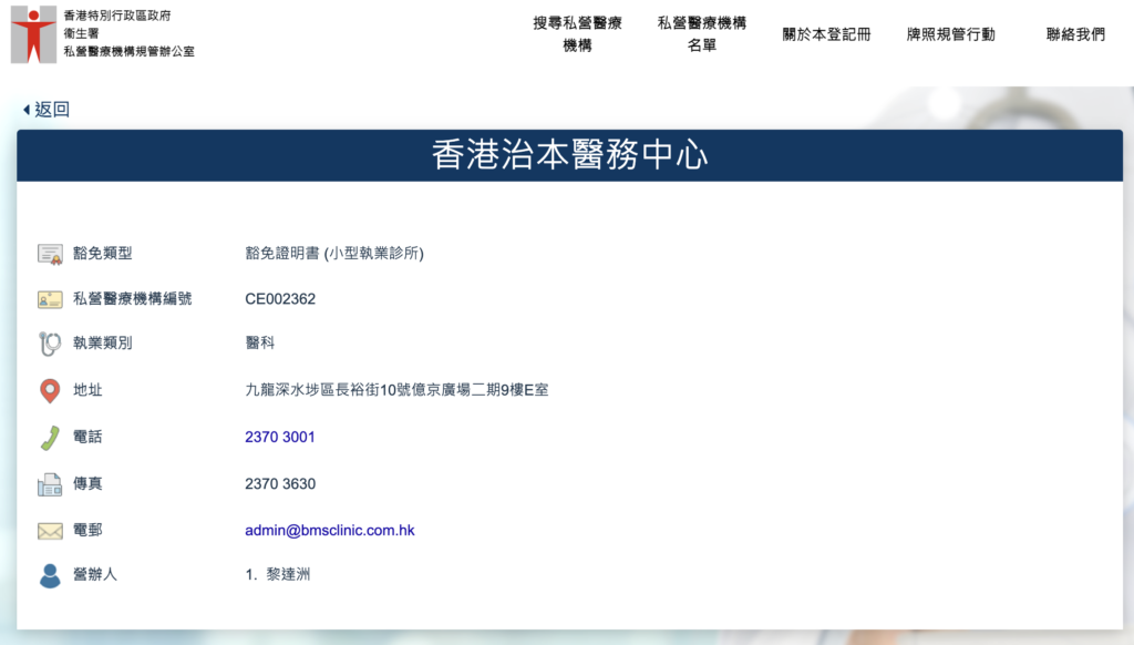 香港治本醫務中心(BMS CLINIC LIMITED)為小型執業診所,已根據《私營醫療機構條例》(第633章)獲發豁免書,並列入衛生署官方登記冊